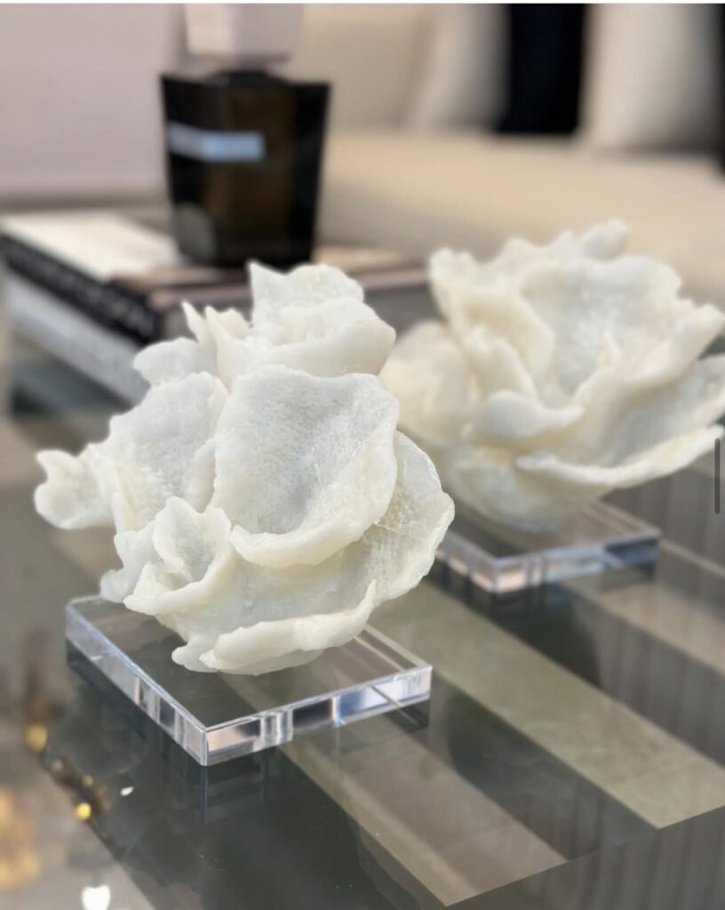 פריט דקורטיבי וייחודי בגוון פנינה, מוצג על בסיס אקרילי שקוף ליצירת מראה יוקרתי ונקי.
