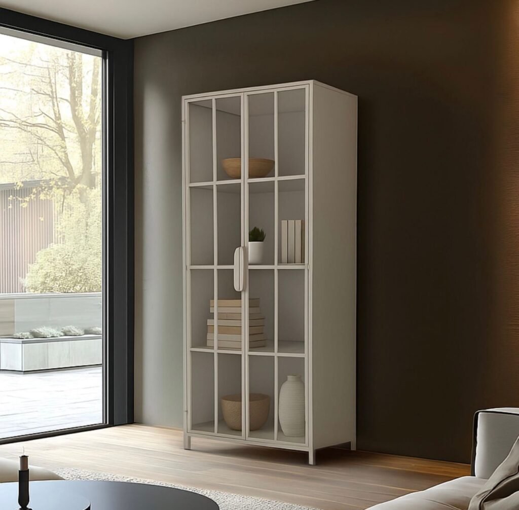 ויטרינה גבוהה ומרווחת בגוון שמנת עם חלוקה סימטרית של זכוכית במסגרת מתכת – אידיאלית לאחסון ולתצוגה של ספרים, כלי נוי או פריטי עיצוב.