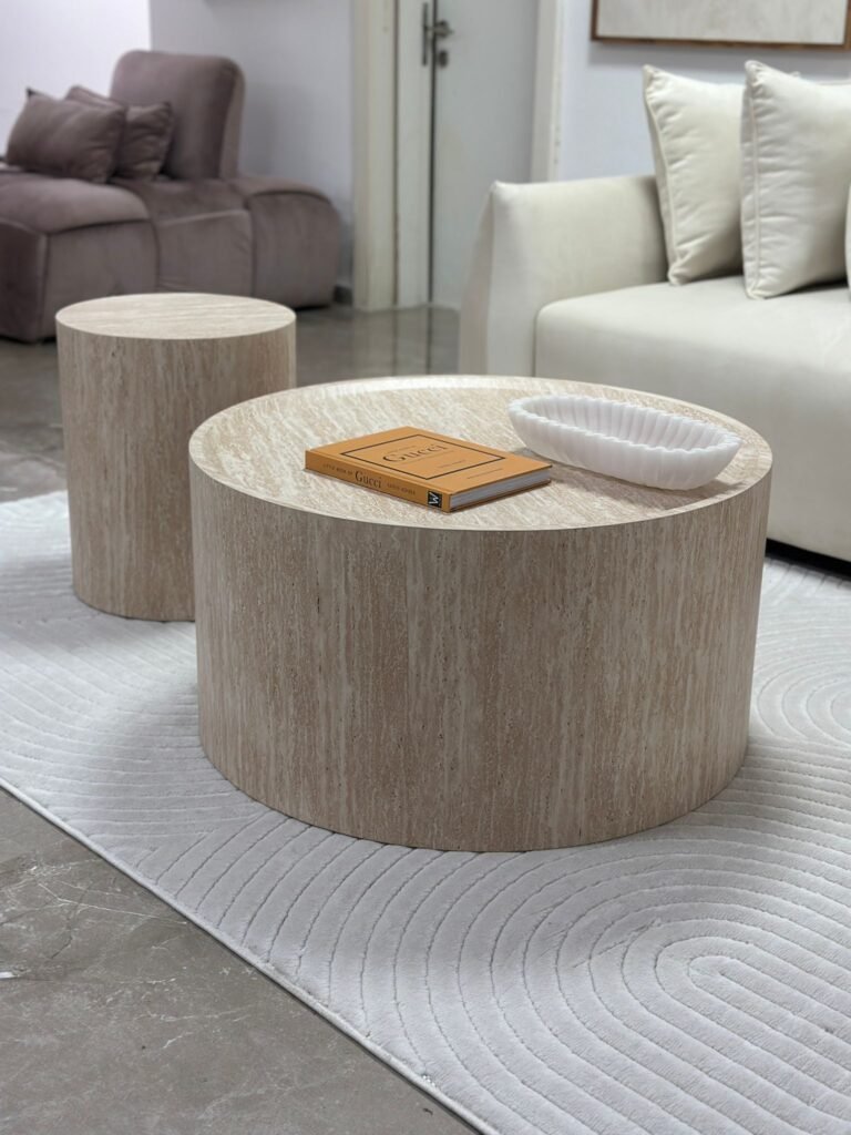 זוג שולחנות סלון עגולים, בעלי מראה טבעי ועדכני בגימור דמוי טרוורטין איכותי.