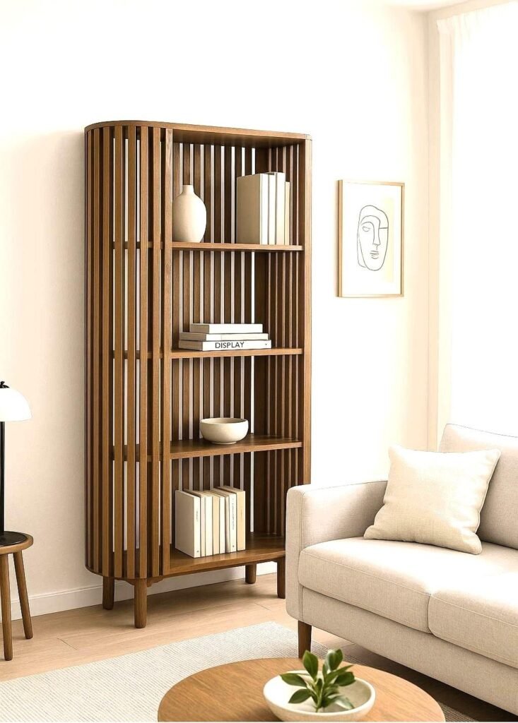 כוננית מדפים מרשימה מעץ מנגו מלא, עיצוב נקי ומודרני בסגנון מדפים פתוחים, משלב מראה טבעי וחם עם פונקציונליות מקסימלת.