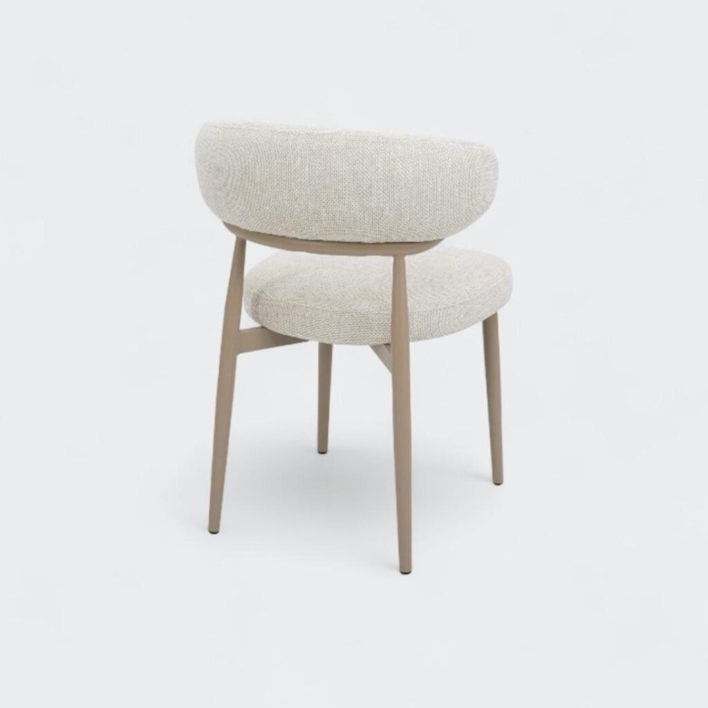 המושב המרופד מבד ארוג איכותי מעניק מראה טבעי וחמים, תוך שמירה על עמידות ונוחות לישיבה ממושכת, רגליים עשויות מתכת חזקה בגימור אלגנטי, לתמיכה מירבית ולמראה נקי ומוקפד בגוון מוקה.