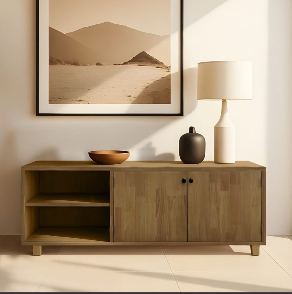 מזנון עץ במראה חם ומודרני, עם שתי דלתות אחסון נוחות ומדף פתוח לפריטים נגישים.