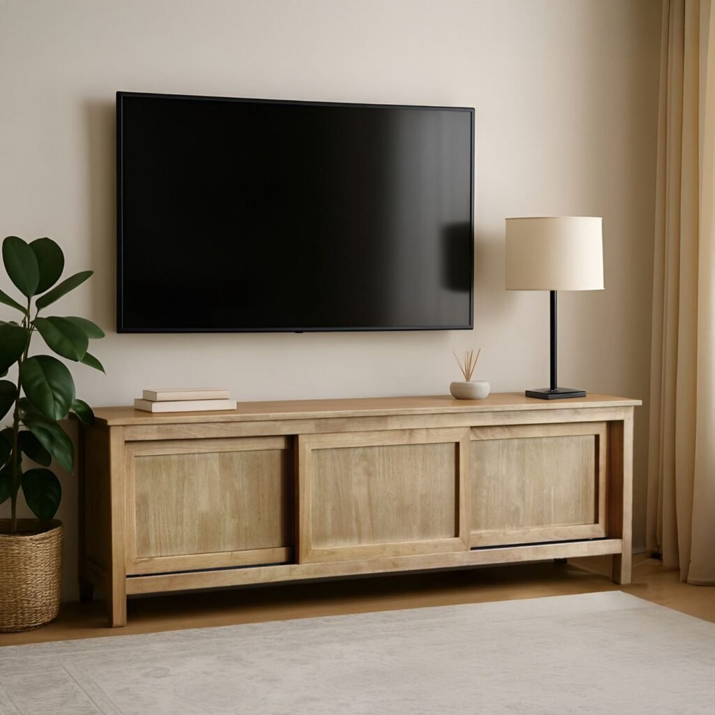 מזנון עשוי מעץ בגוון טבעי חמים, עם 3 דלתות הזזה.