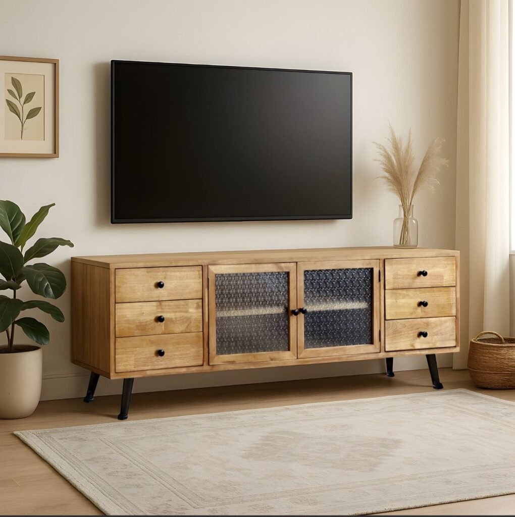 וינה – מזנון עץ טבעי עם 6 מגירות ודלתות זכוכית דקורטיביות.