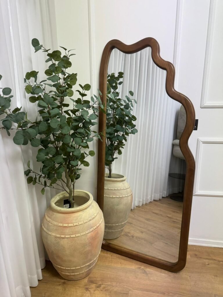 מראה עומדת בעיצוב אמורפי בגוון אגוז.