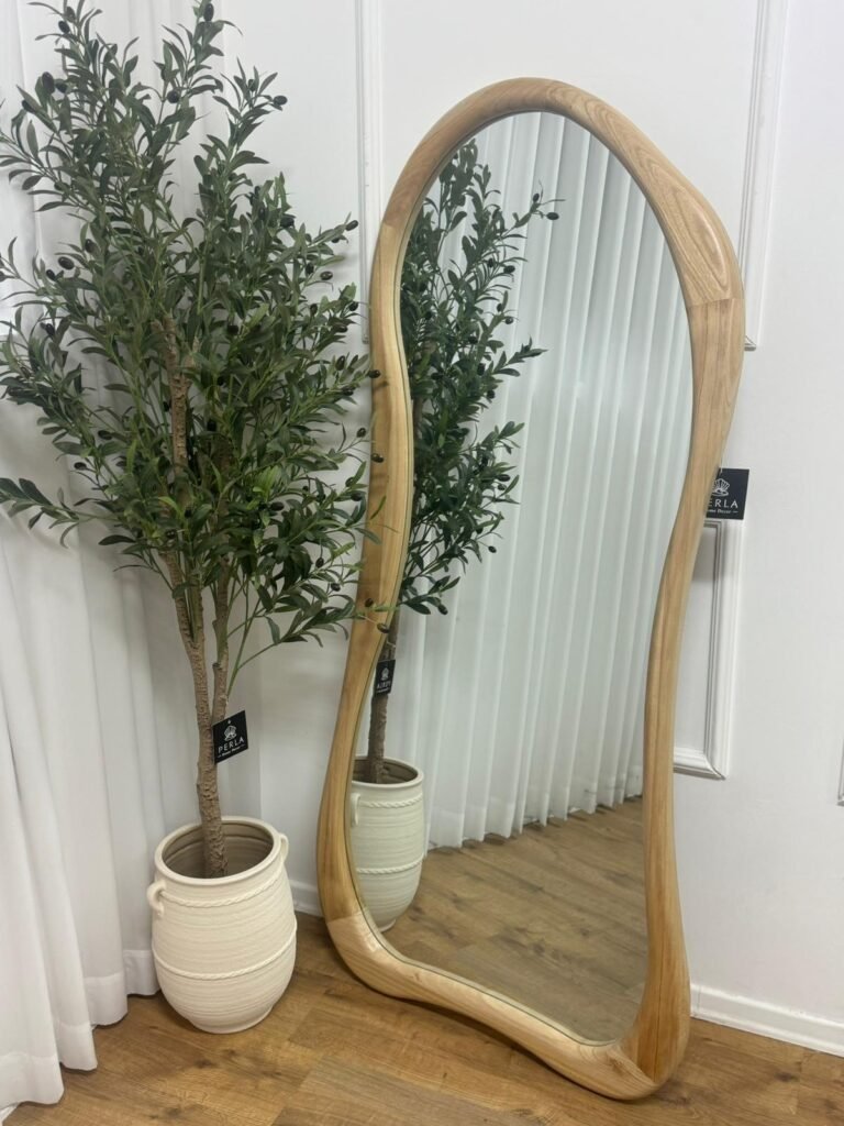 מראה עומדת בעיצוב אמורפי בגוון עץ טבעי.