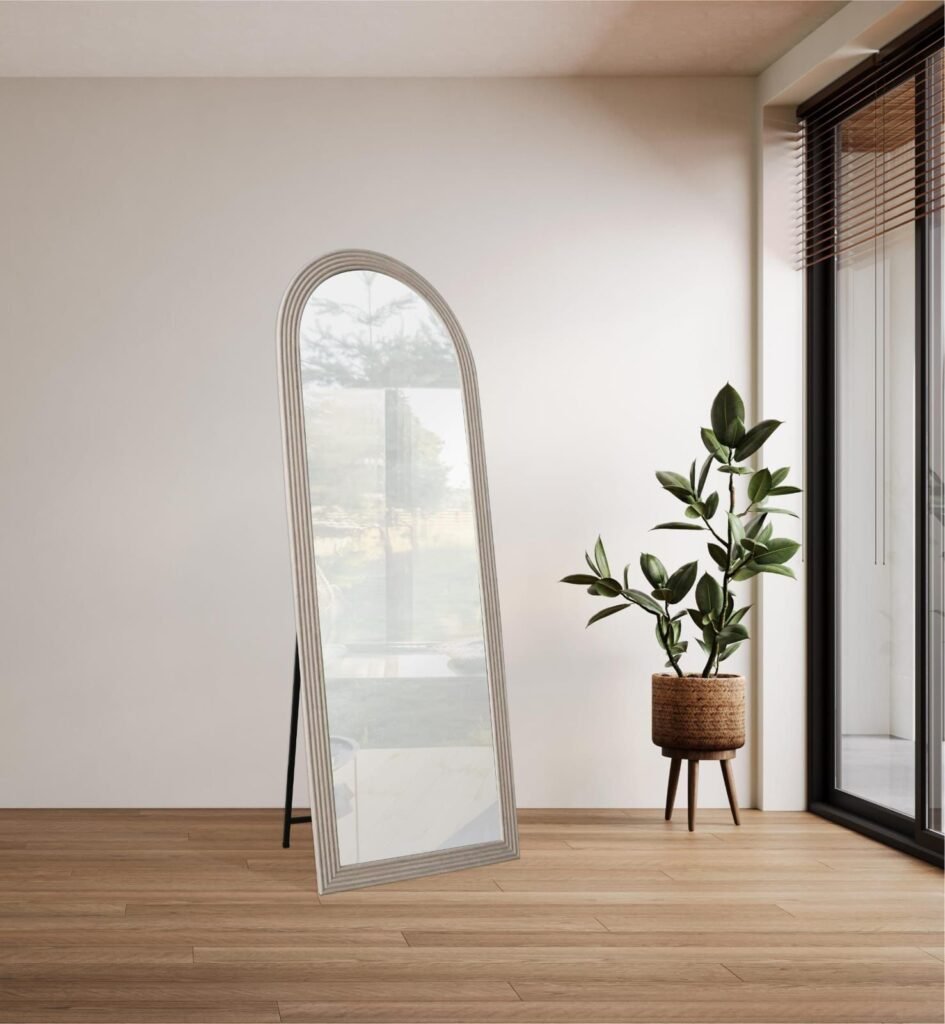 מראה קשתות מרשימה עם מסגרת דמוי טרוורטין בגוון בז', שמוסיפה חמימות ואופי טבעי לכל חלל.