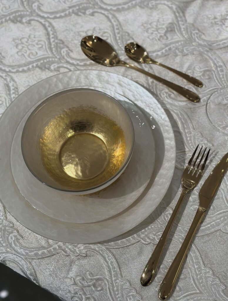 מערכת אוכל יוקרתית מזכוכית בשילוב זהב, שמוסיף נגיעה של אלגנטיות ויוקרה לכל ארוחה.