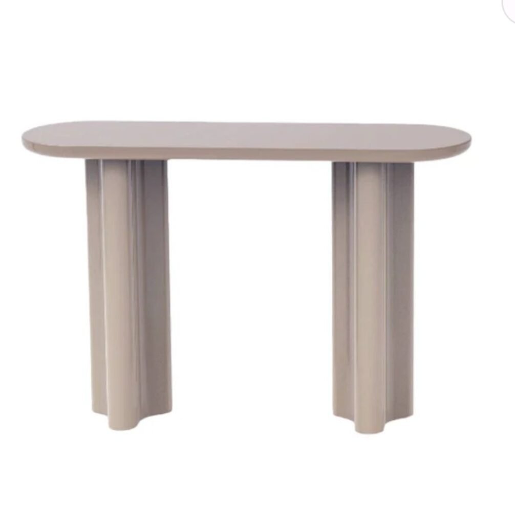 קונסולה גלוסי אובלית בגוון ניוד. שולחן המעוצב פלטה מעוגלת,