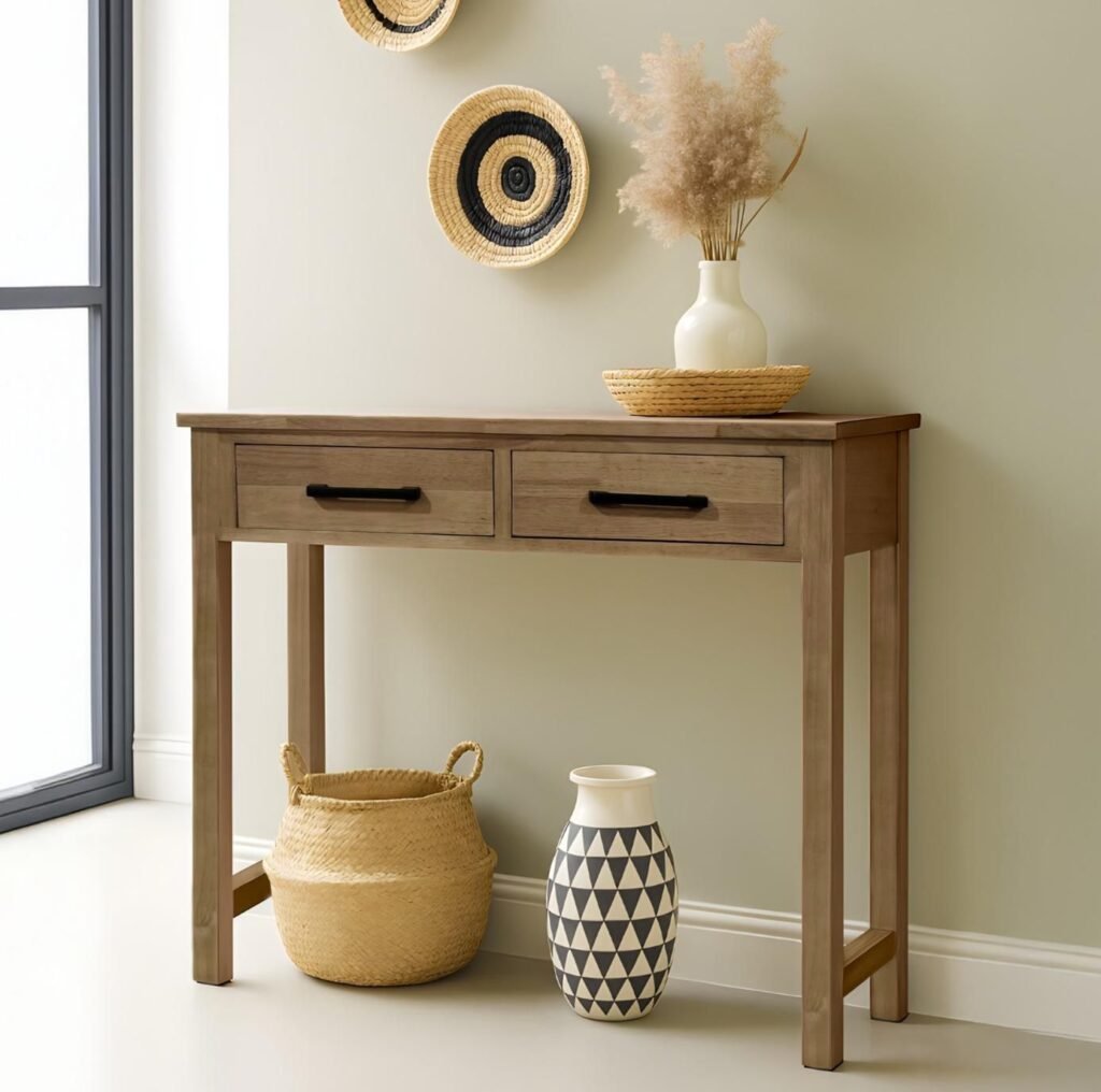 קונסולה אלגנטית מעץ בגוון טבעי, עם שני מגירות נוחות וידיות מתכת שחורות לסטייל מודרני ונקי.
