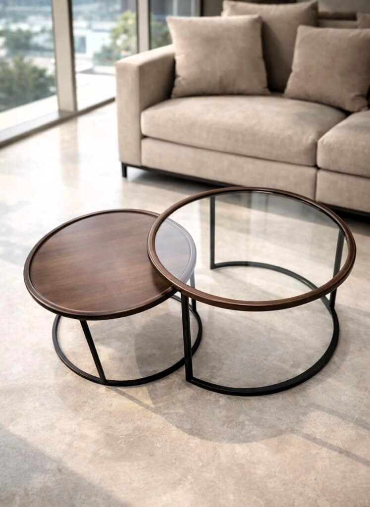 סט שולחנות סלון עשויים מעץ מלא בשילוב זכוכית מחוסמת חזקה ועמידה.