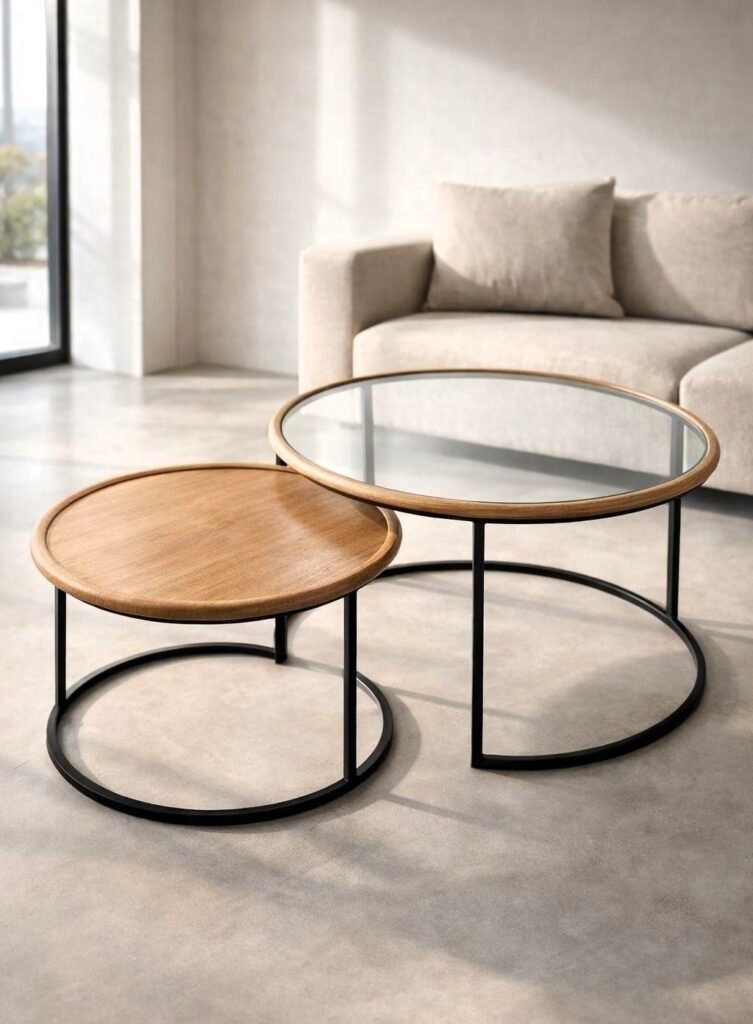 סט שולחנות סלון עשויים מעץ מלא בשילוב זכוכית מחוסמת חזקה ועמידה.