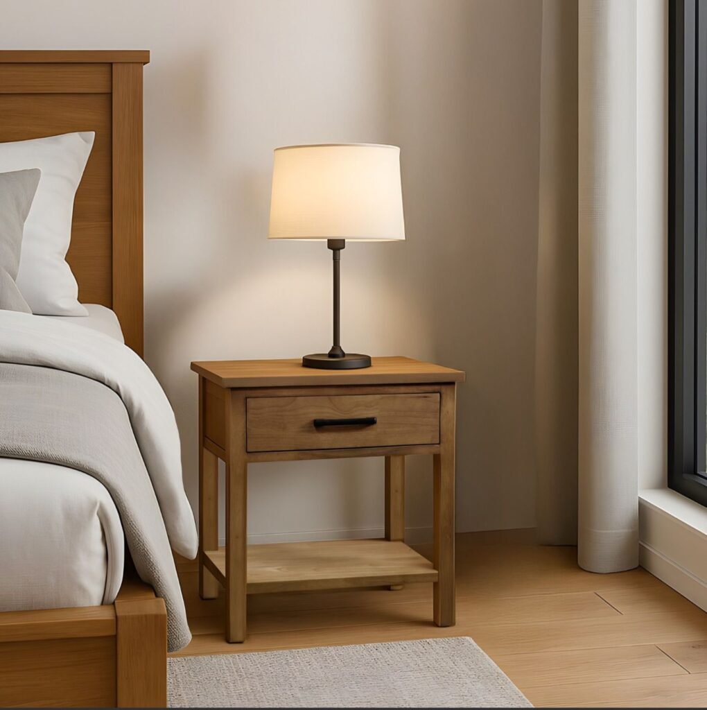 שידת לילה קלאסית בעיצוב על-זמני, עשויה עץ בגוון טבעי חמים.