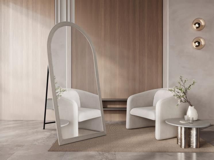 מראה קשתות מרשימה עם מסגרת דמוי טרוורטין בגוון בז', שמוסיפה חמימות ואופי טבעי לכל חלל.