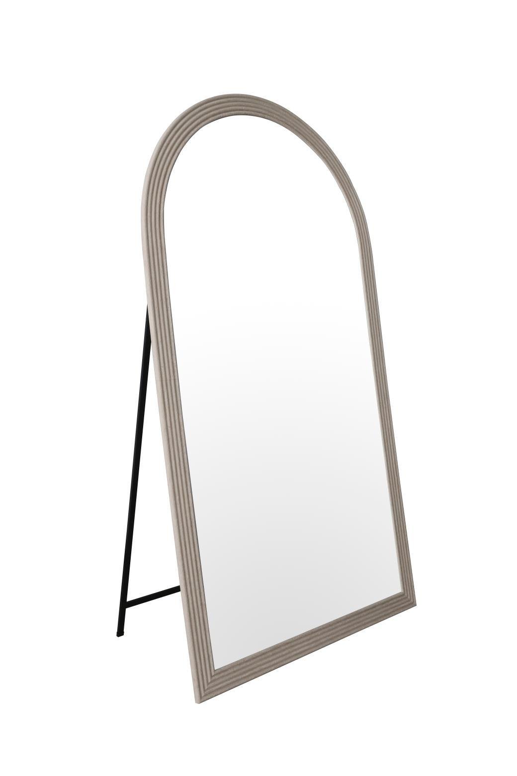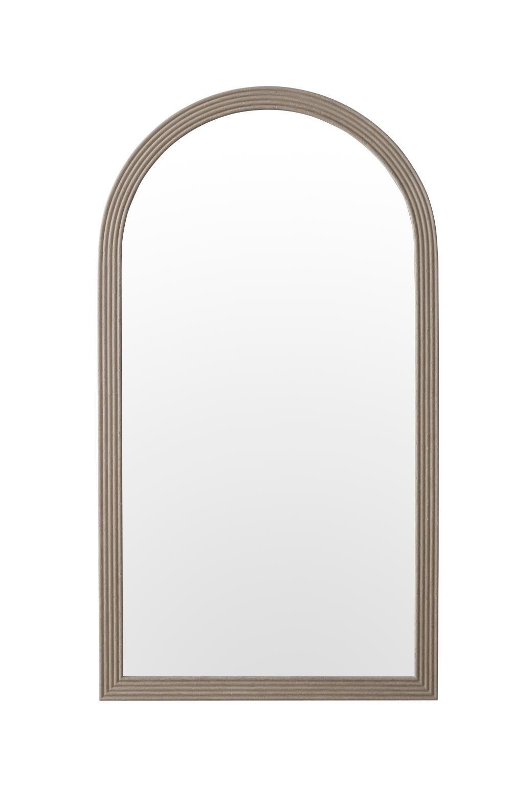 מראה קשתות מרשימה עם מסגרת דמוי טרוורטין בגוון בז', שמוסיפה חמימות ואופי טבעי לכל חלל.